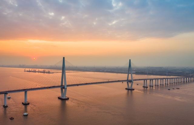 以杭州灣跨海大橋為例,這座連接浙江嘉興與寧波的跨海大橋,以36公里的長度成為世界上最長的跨海大橋。大橋蜿蜒曲折,給人的視覺震撼自不必說,尤其等到夜間,橋上亮起星星點點的燈光,在壯闊大海的映襯下更為壯觀。